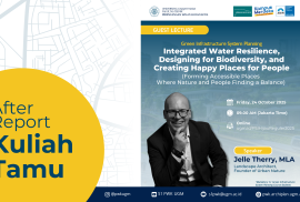 Jelle Thery membahas konsep arsitektur lanskap yang berpusat pada hubungan harmonis antara manusia dan alam. Isu utamanya menyoroti pentingnya Regenerative Design, yaitu pendekatan perancangan yang tidak hanya berfokus pada keberlanjutan, tetapi juga pada pemulihan ekosistem alam. Pendekatan ini mengintegrasikan pengelolaan air perkotaan (water resiliency), peningkatan keanekaragaman hayati (biodiversity), serta penciptaan ruang publik yang sehat dan membahagiakan (happy places). Dalam konteks ini, Jelle menyampaikan bahwa alam dipandang sebagai sistem yang saling terhubung dengan manusia, bukan sekadar latar belakang, sehingga desain harus menciptakan simbiosis antara keduanya.